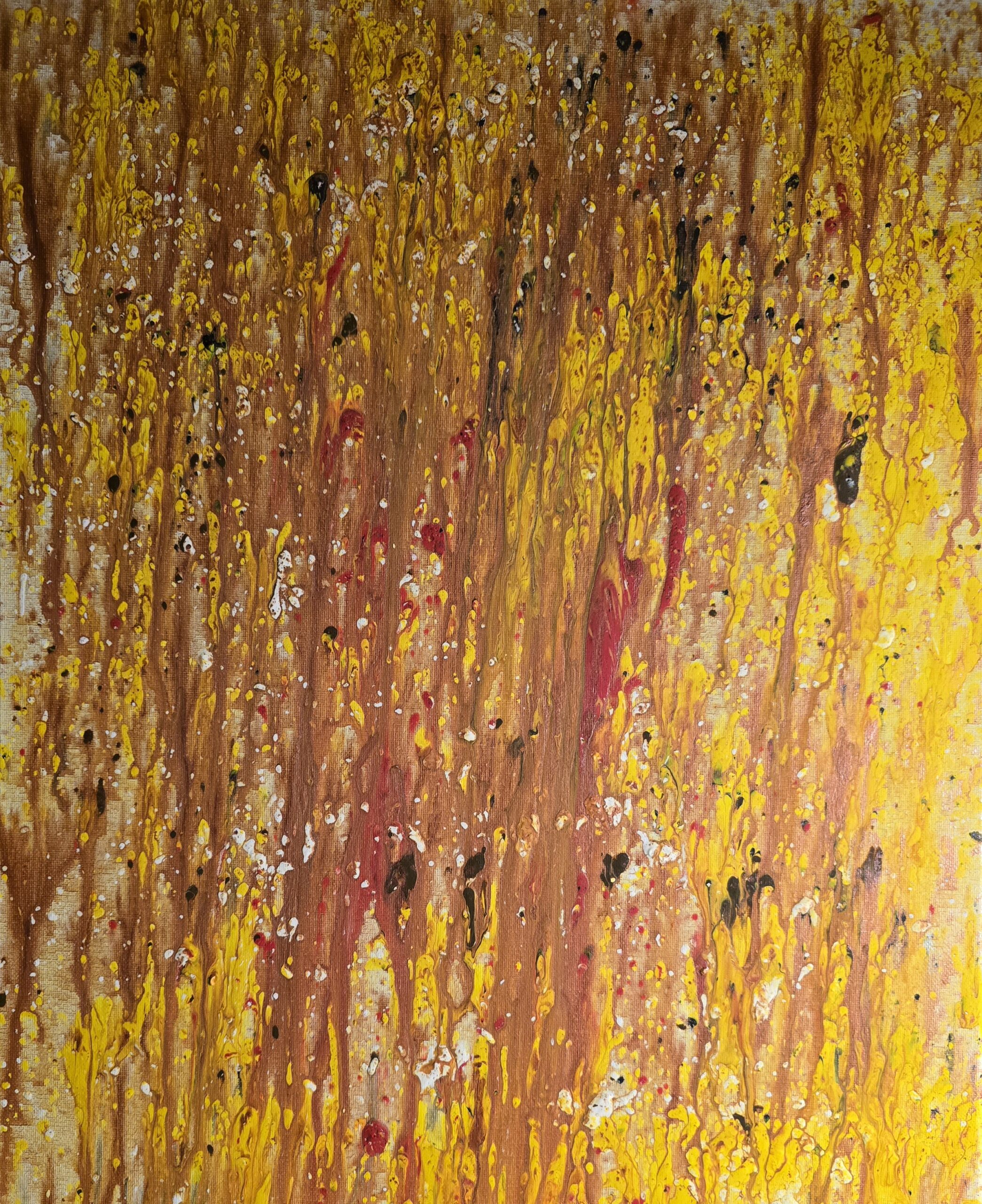Dans Pluie d’Or, les teintes chaudes se déversent en une cascade lumineuse, évoquant une averse dorée sur une terre enflammée. Entre éclats d’ocre, de jaune profond et touches de rouge, cette œuvre transporte le regard dans un tourbillon d’intensité et de chaleur.