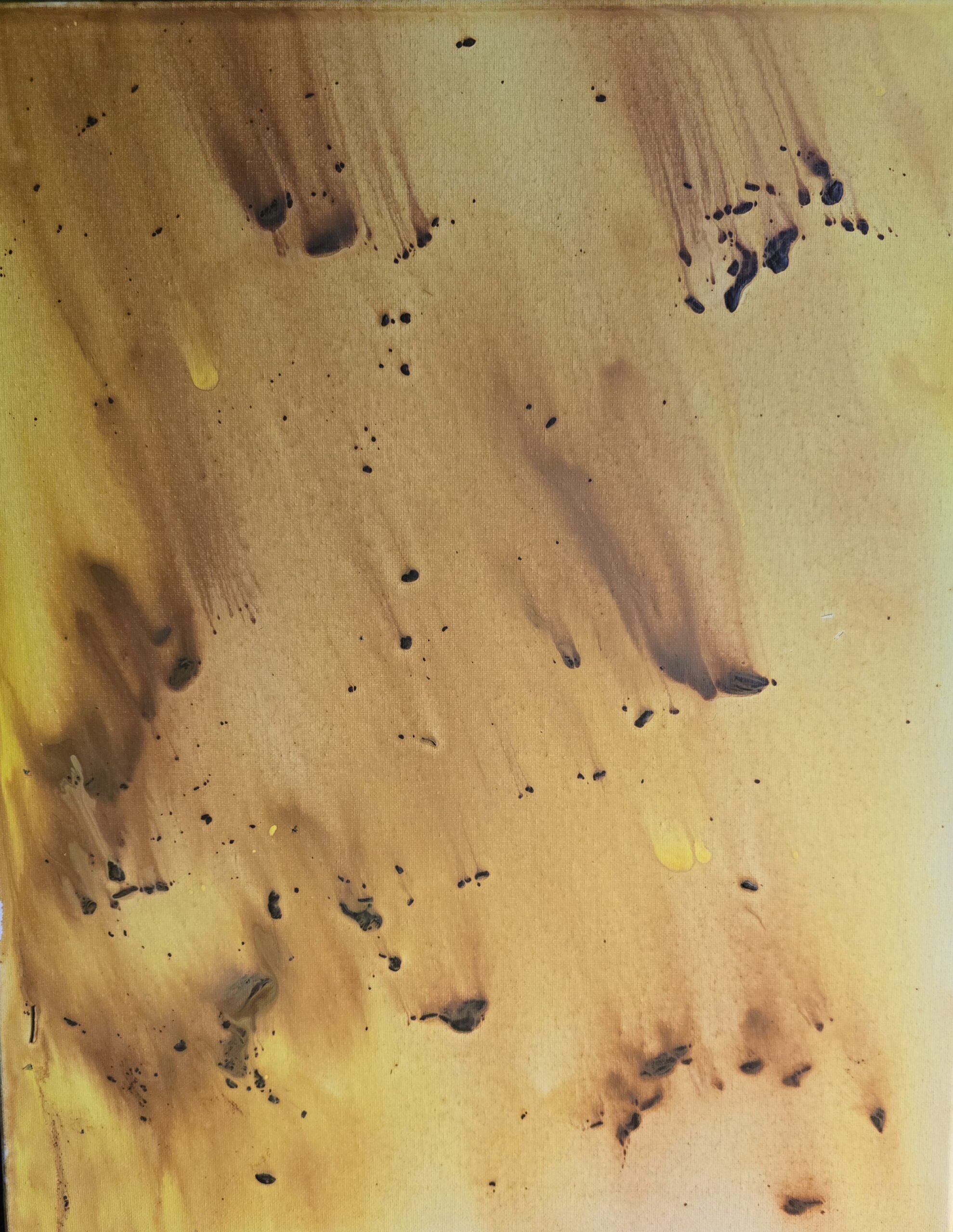 « Brasas » capture la chaleur et l’intensité des braises incandescentes, avec des teintes dorées et des nuances sombres qui semblent danser sur la toile. Les traces fluides et les éclats épars évoquent un mouvement organique, presque hypnotique, rappelant la combustion lente du bois ou la texture d’une surface embrasée par le temps.