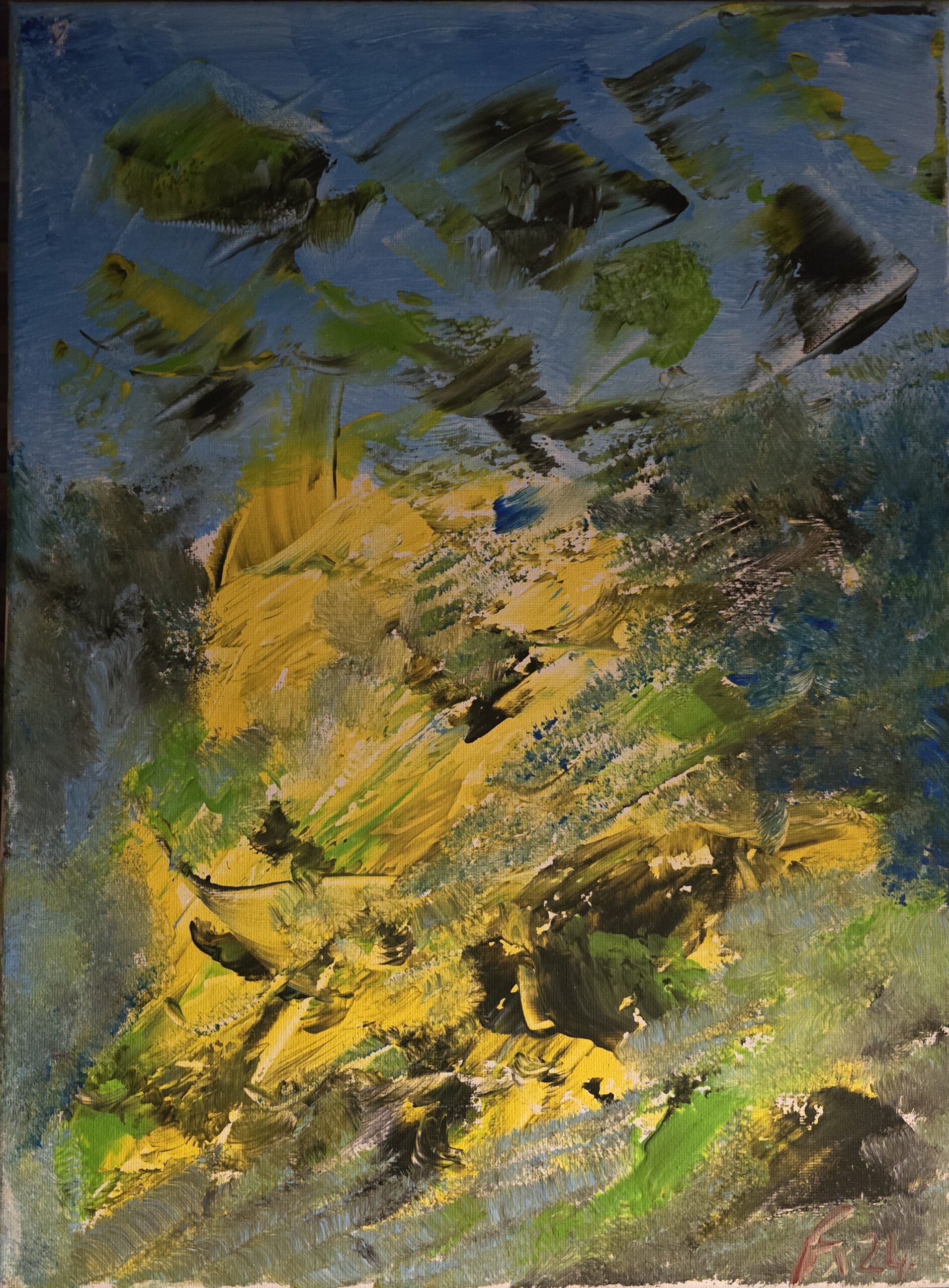 « Terre d’Espoir » est une œuvre vibrante qui célèbre la résilience et le renouveau. À travers des nuances de bleu et jaune, couleurs emblématiques, Lorenzo Art exprime un mélange d’émotion et de lumière, symbolisant l’espoir, la nature et l’avenir. Les touches de vert apportent une harmonie apaisante, tandis que le mouvement dynamique des pinceaux insuffle à cette toile une énergie vivante.
