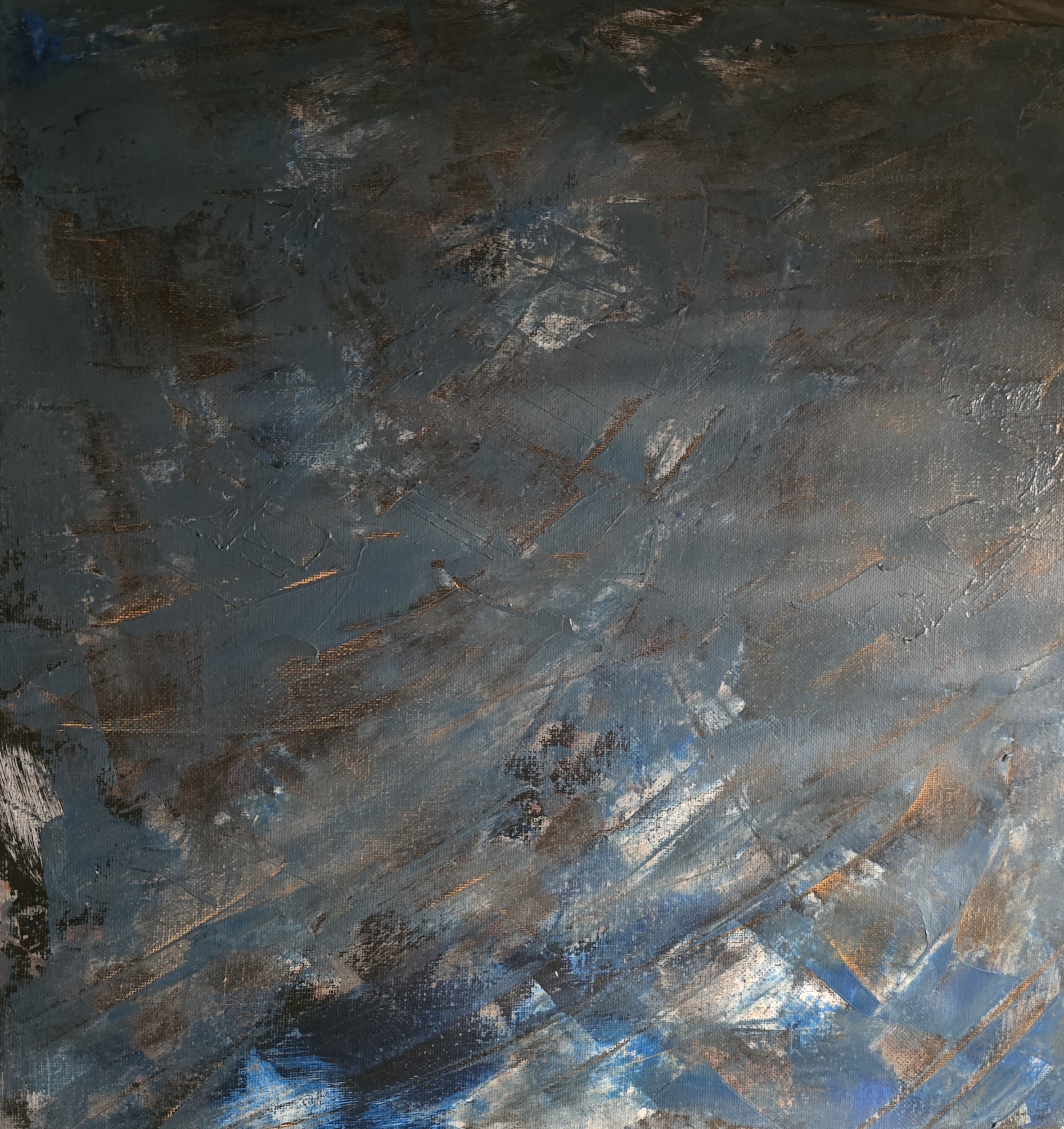 Chaque coup de pinceau, chaque texture révèle un jeu subtil entre lumière et ombre, transportant l’observateur dans un voyage introspectif. Les teintes métalliques ajoutent une dimension presque cosmique, rappelant les reflets lunaires sur un océan calme ou les vestiges d’une tempête lointaine.